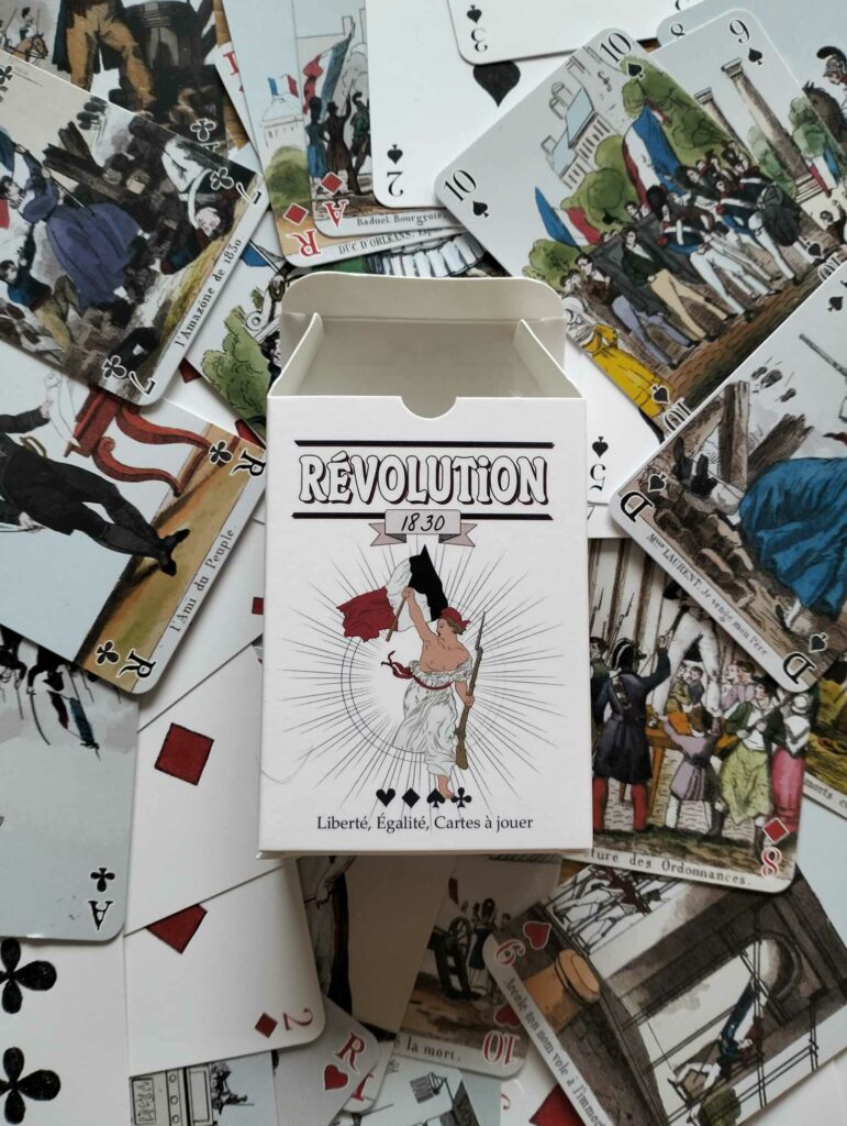 - Ajout de deux cartes jokers « Coq de la victoire » : Pour que le jeu soit un véritable 54 cartes, il nous fallait créer les deux jokers. Nous avons opté pour le symbole du coq, attaché à cette révolution de 1830.